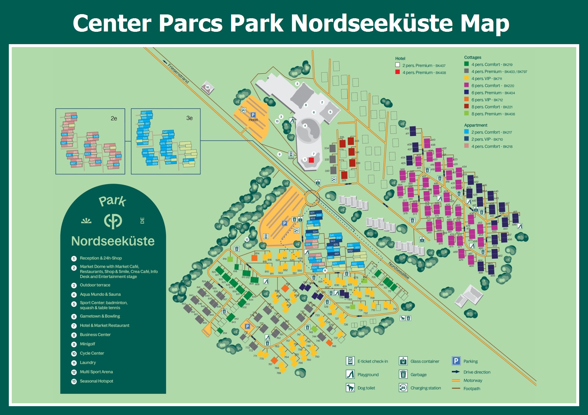 Up-to-date and comprehensive village map of Center Parcs Park Nordseeküste with all accommodations and facilities, also available as PDF.
