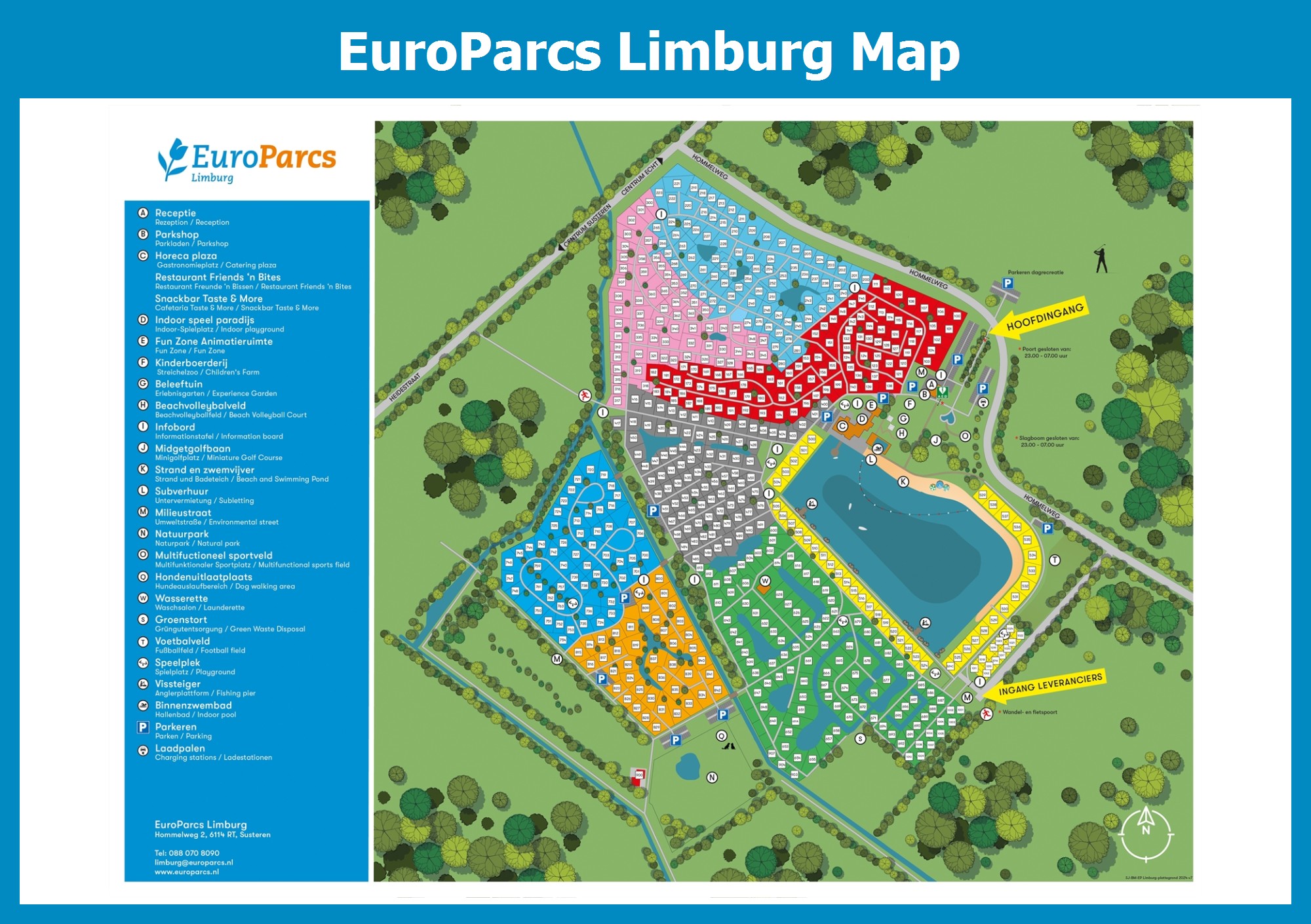 Up-to-date and comprehensive village map of EuroParcs Limburg with all accommodations and facilities, also available as PDF.